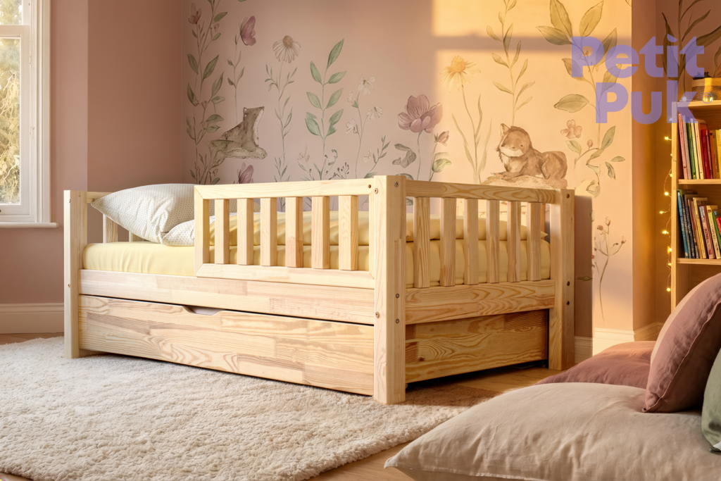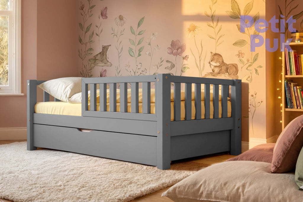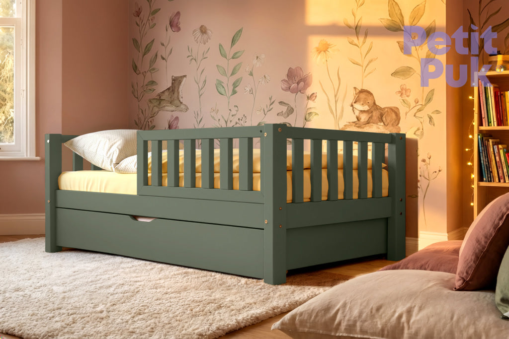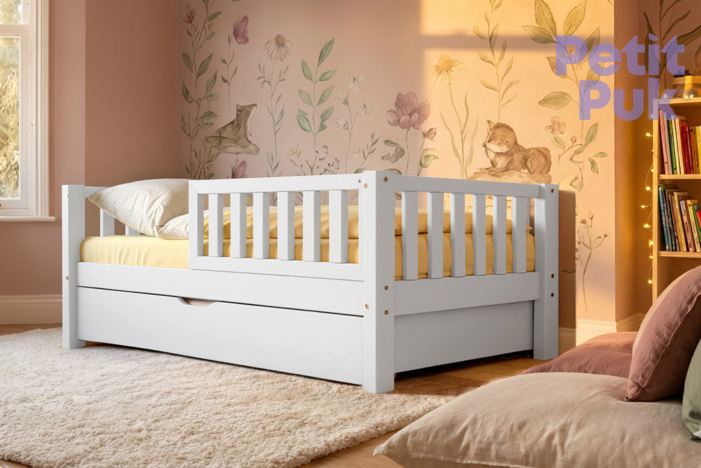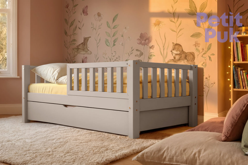 Dieses Kleinkindbett TED macht den Übergang von einem Babybett zu einem Kinderbett zum Kinderspiel. Die perfekte und freundliche "Barriere" verleiht dem Bett im Montessori-Stil ein Gefühl von Komfort und Sicherheit. Ein toller Treffpunkt für die Kleinen zum Spielen und Schlafen. Und trotzdem stylisch.