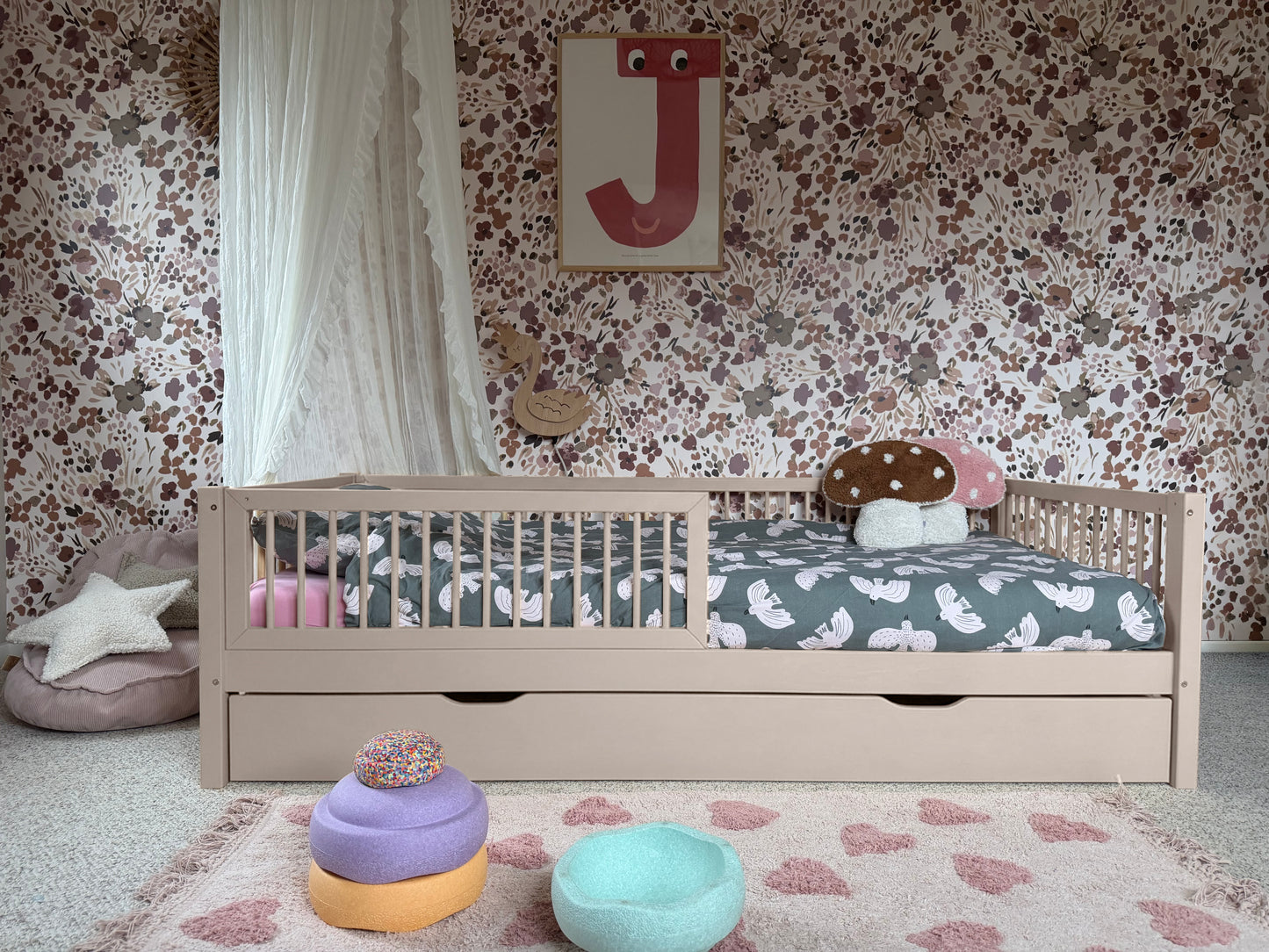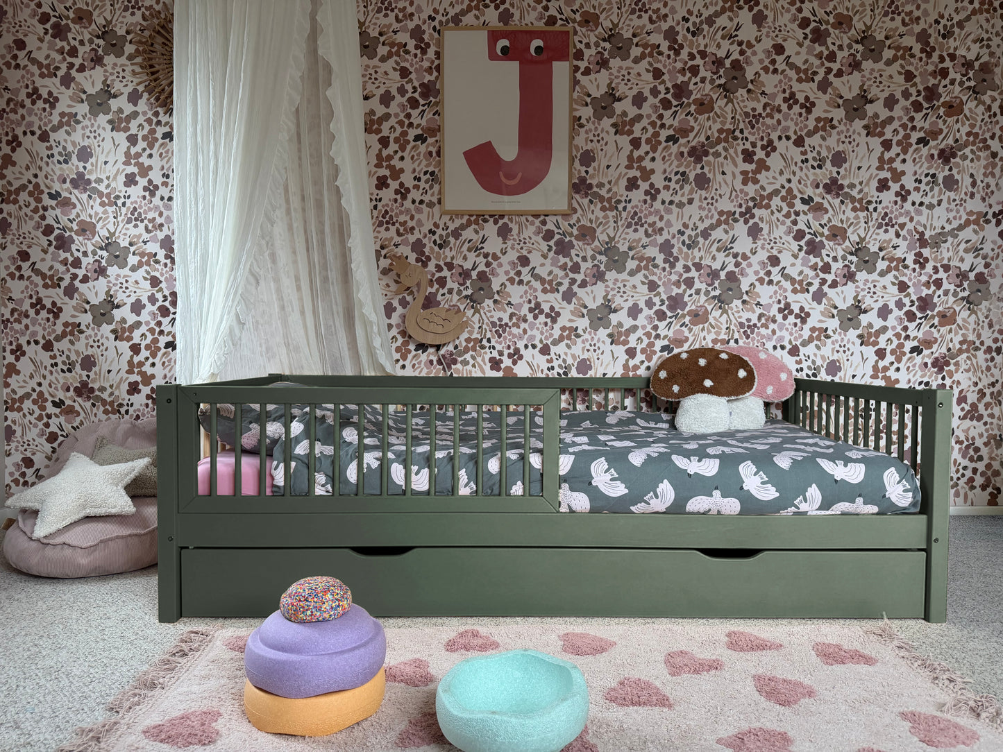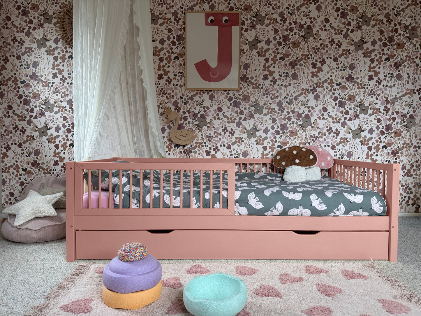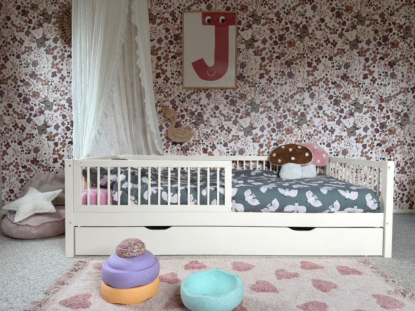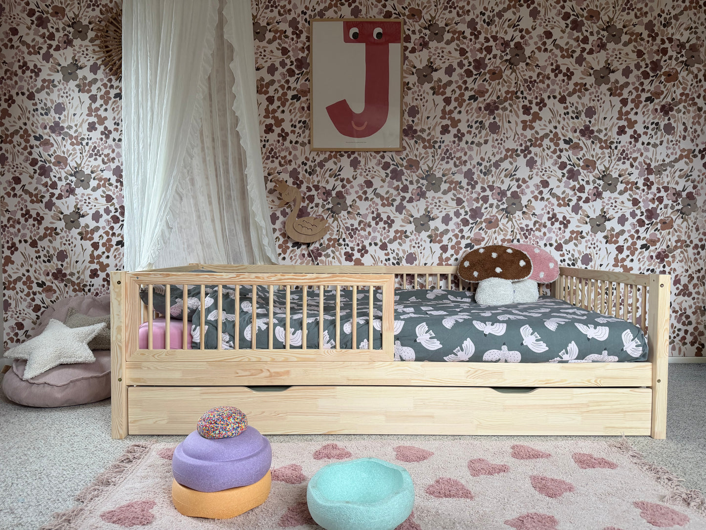 This junior bed makes transitioning from a crib to a kids bed easy-peasy. The rounded fence add a sense of comfort and security to the Montessori-style floor bed. A great hangout for the little ones to play and sleep. And yet stylish too.