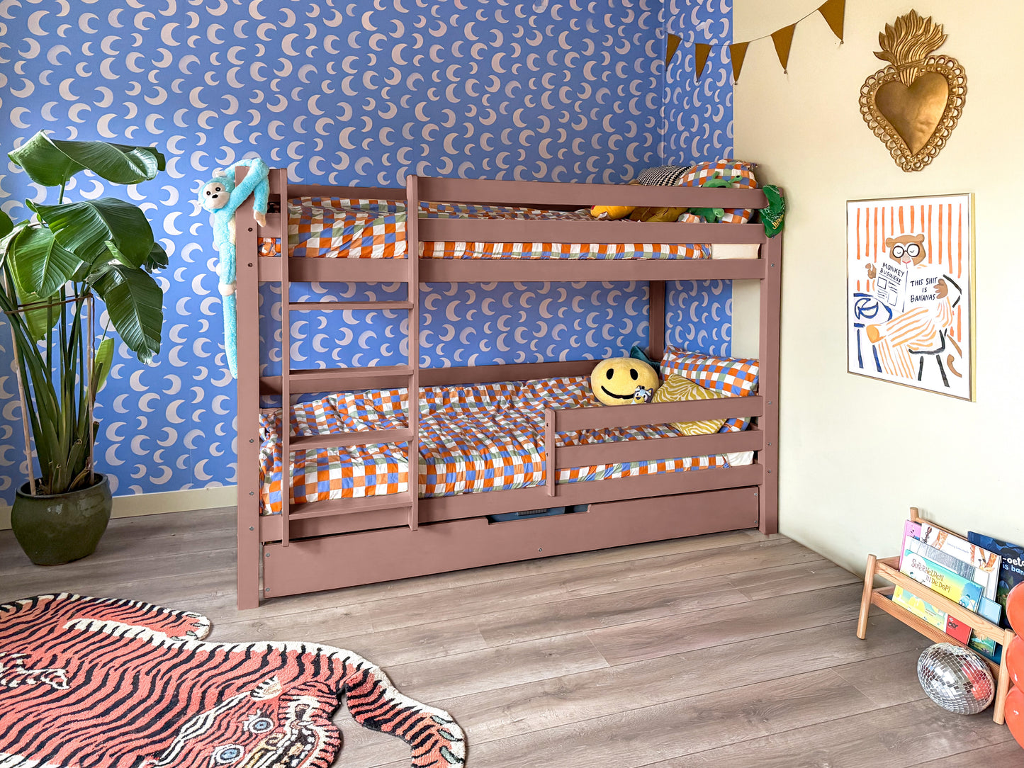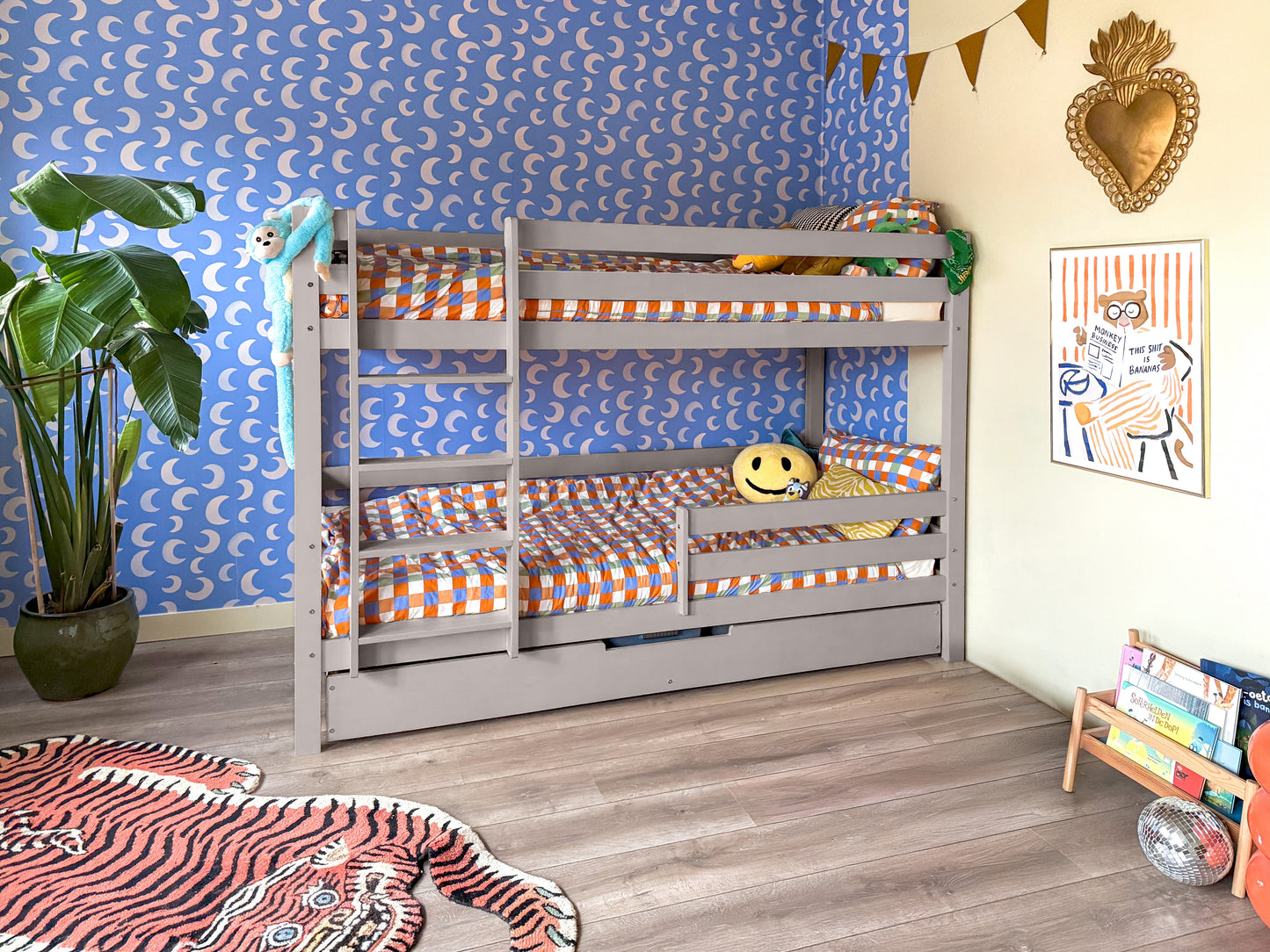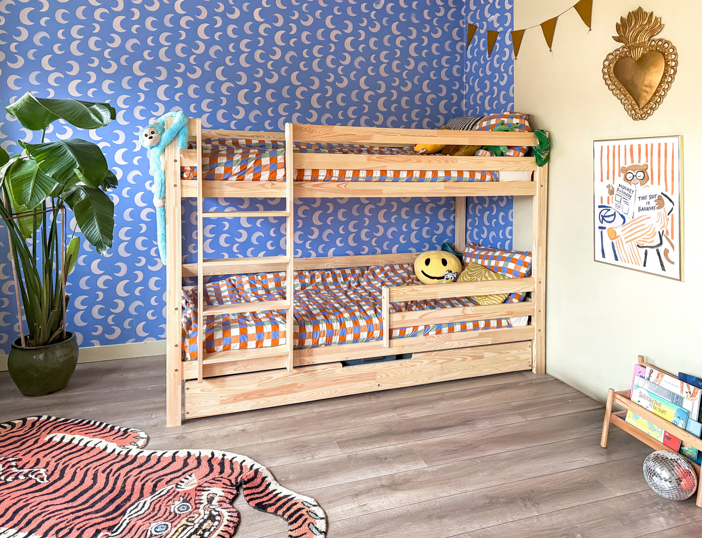 Esta litera es una versión de litera de poca altura: la cama superior está a solo 100 cm del suelo, lo que la convierte en una cama ideal para los primeros en adoptar literas; los pequeños que sus padres conocen por ser buenos y firmes escaladores y no locos por tener un sueño salvaje. Duerma o juegue todo el día en esta linda litera Milly. Agregue un montón de almohadas de gran tamaño y la cama inferior se convertirá en la zona de descanso ideal. Milly es su mejor amiga para las fiestas de pijamas.