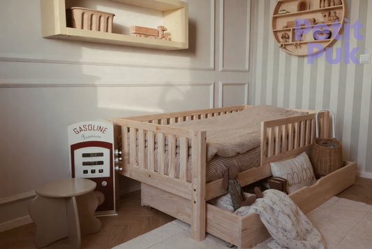 Tutti i lettini PETIT PUK sono realizzati in legno solido e resistente. Ciò garantisce letti solidi e sicuri in cui il tuo bambino (e gli eventuali fratelli che lo seguono) possano dormire sonni tranquilli. Un lettino in legno si adatta perfettamente alla tendenza attuale che vede sempre più spesso l'introduzione di materiali naturali nelle camerette dei bambini. Il look senza tempo del lettino in legno garantisce che durerà a lungo e si adatterà a qualsiasi stanza, che tu abbia un piccolo amante degli animali con una stanza safari, un mini astronauta con il fascino per lo spazio o una vera principessa con una dolce cameretta.