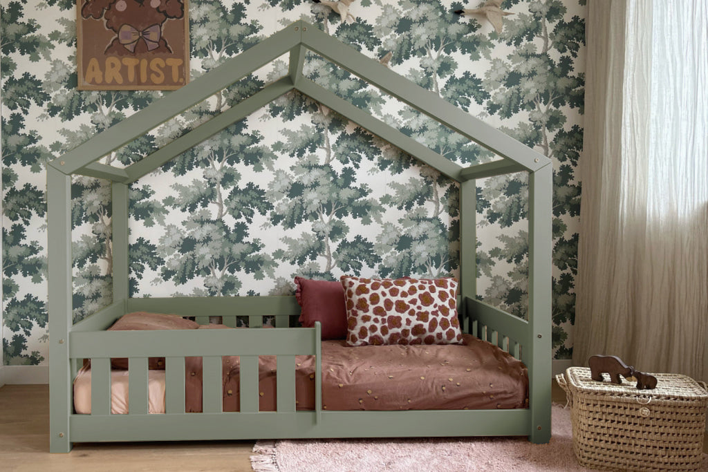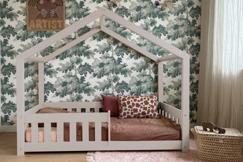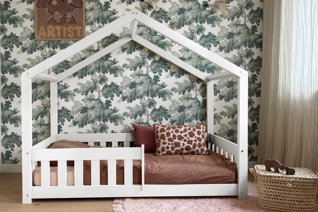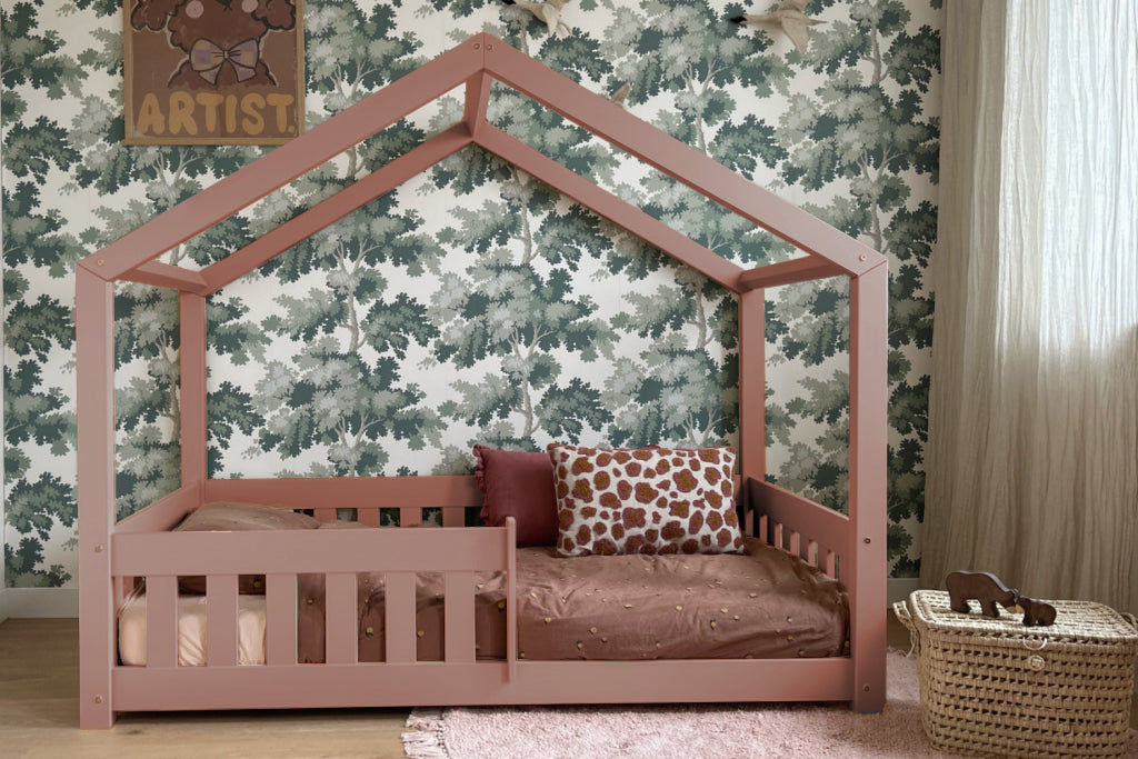 Bedhuisje TINTIN maakt de overgang van een ledikant naar een kinderbed heel eenvoudig. Het dakvormige frame en het platte hekje geven het Montessori-vloerbed een gevoel van comfort en veiligheid.