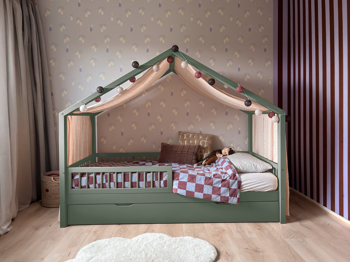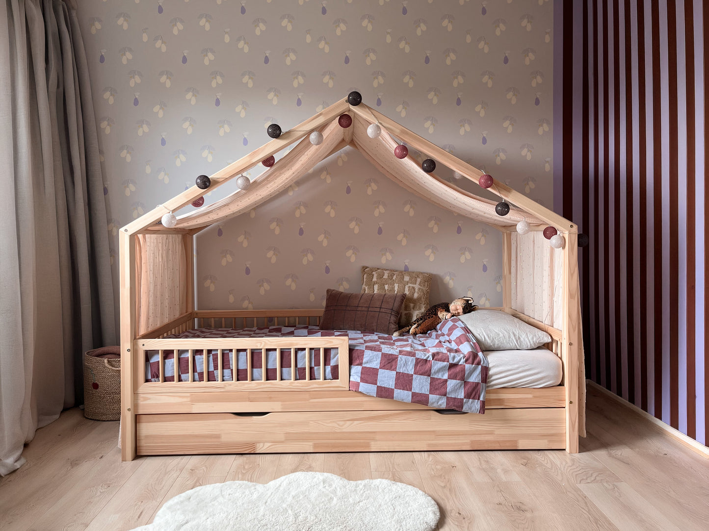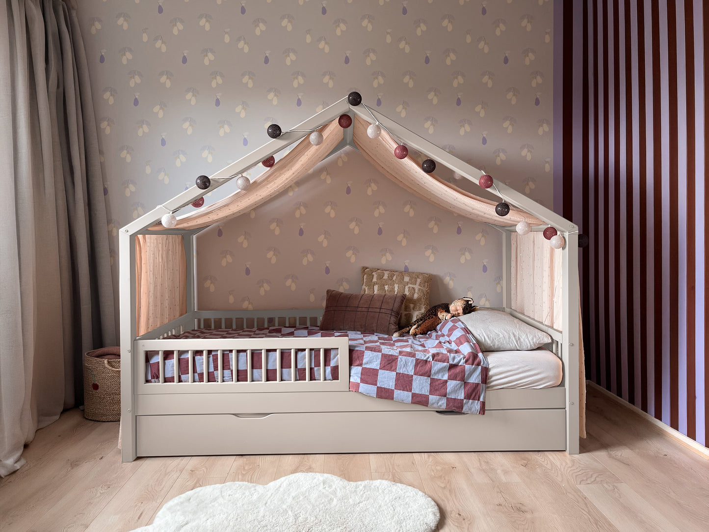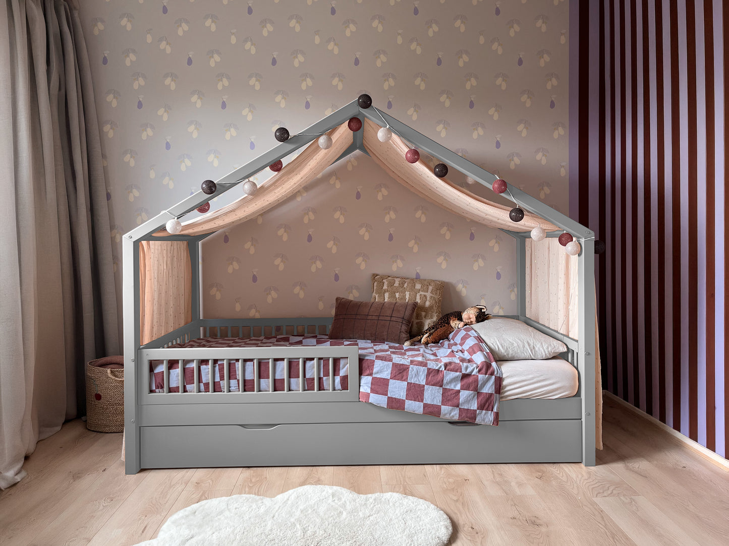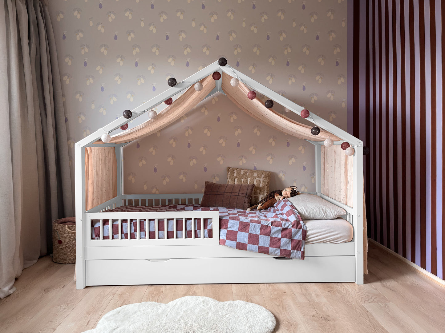 Peuterbed Cato maakt de overgang van een ledikant naar een kinderbed een fluitje van een cent. Het dakvormige frame en de slanke omheining geven het vloerbed in montessoristijl een gevoel van comfort en veiligheid. Een geweldig bedhuisje voor de kleintjes om in te spelen en te slapen. Ook nog eens uit te breiden met lades en andere accessoires...