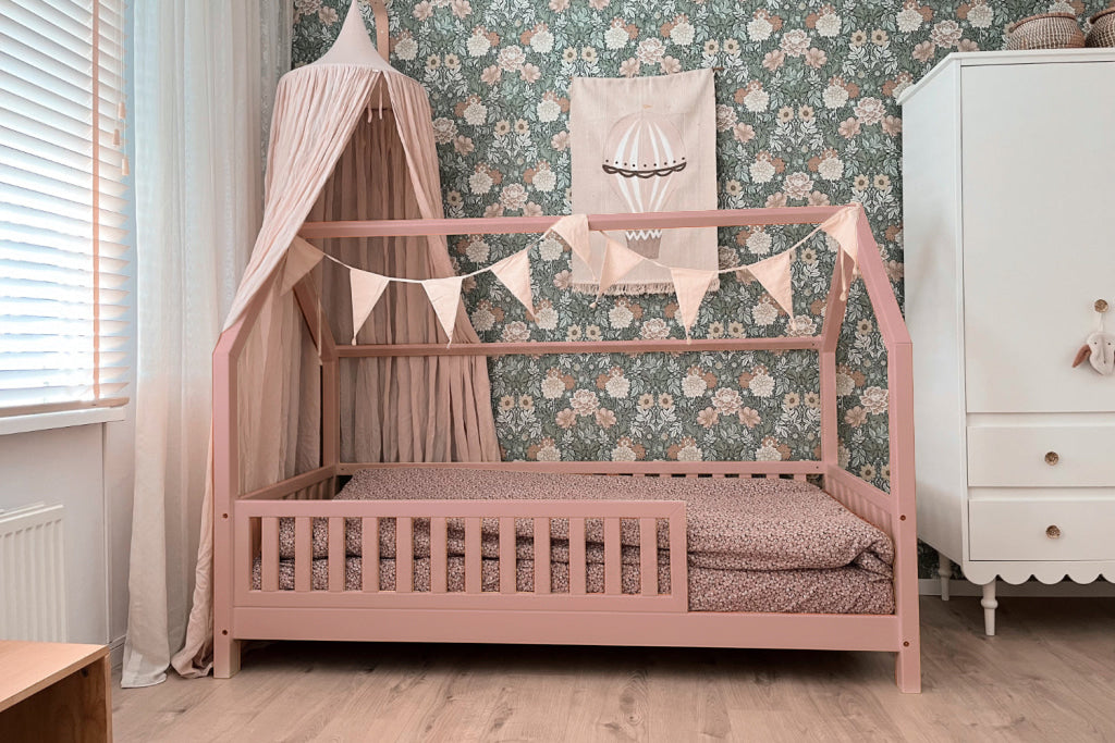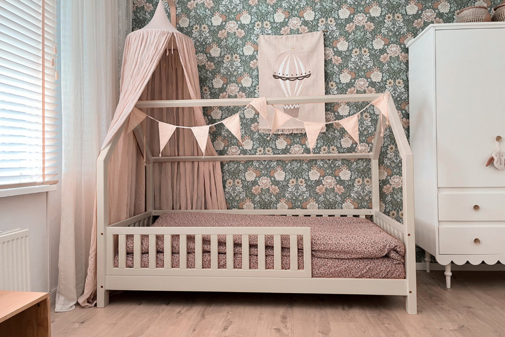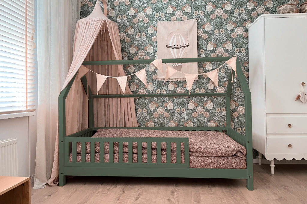 Het peuterbed NOLITA is een Montessori-geïnspireerd (vloer)bed met een knus dakje en mooie (aanpasbare) beschermhekjes. De hekjes aan de voorzijde kunnen eenvoudig weggenomen worden wanneer deze niet meer nodig zijn.